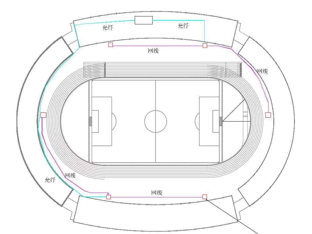 因此,整个音响系统的电子部分布置如下,MIDAS PRO9担任此次开幕式的主调音台,M32为备份调音台一并置于主席台旁边观众席区域上部,功放机柜分六个点分别置于入场口4个角落和跑道两个弧形顶位置。一个体育场,内圈跑道为标准的400米,而防爆沟区域约有700多米,恰恰我们的设备就是分布在这样一个700多米的圈圈上,如下图A、B、C、D、E、F六个位置上。